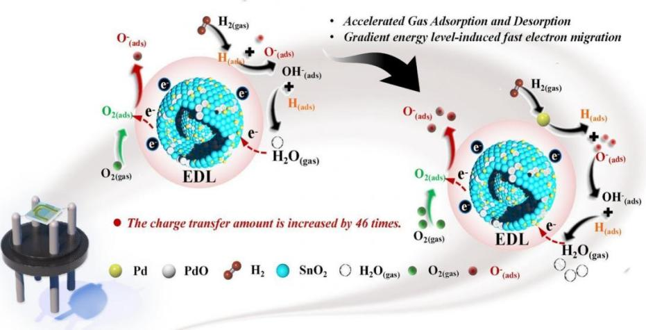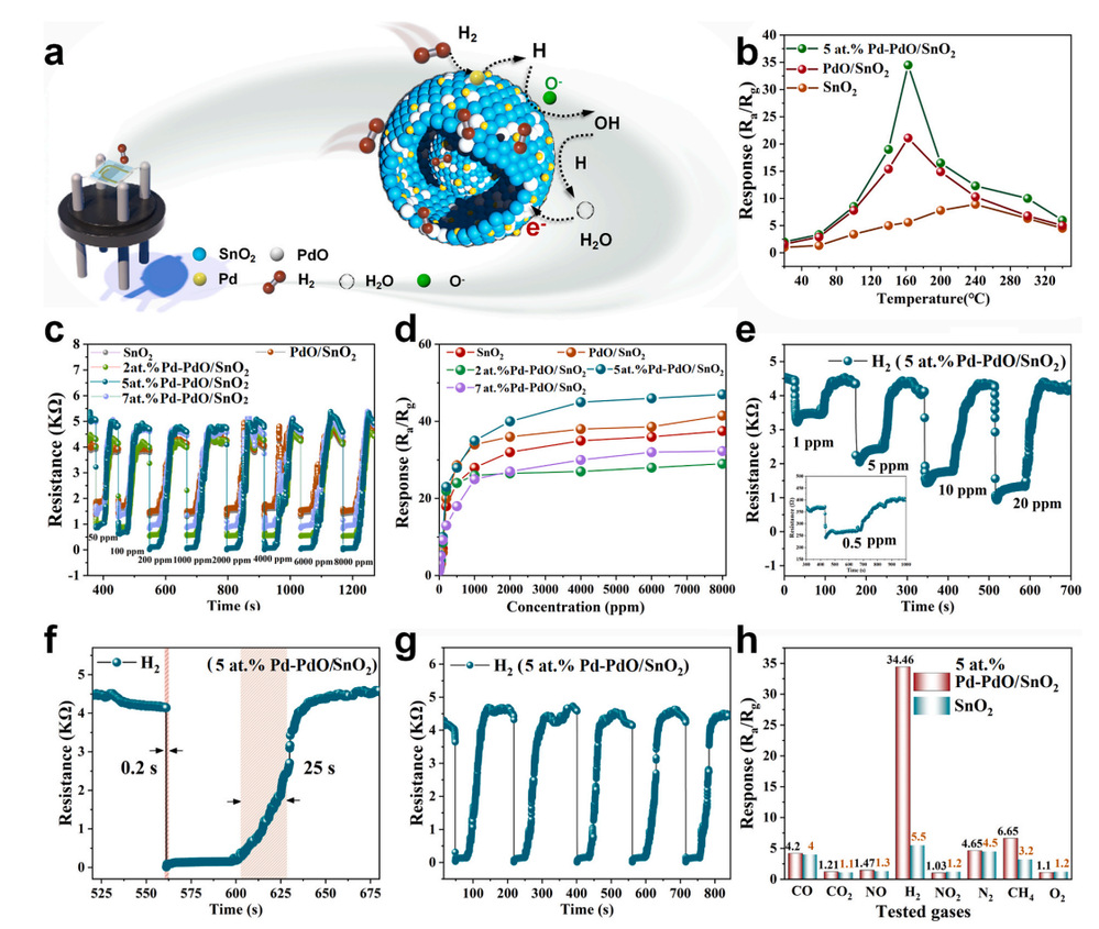 近期,研究团队聚焦金属氧化物半导体(MOS)在氢气检测中的核心技术瓶颈,创新性地构建出一种具备梯度能级结构的介孔Pd-PdO/SnO₂双壳微球传感器,突破传统材料在灵敏度、响应速度、抗干扰与湿度容忍度等多维性能的瓶颈限制。研究通过软模板诱导调控手段,精确构筑出Pd富集外壳/Sn富集内壳的核壳结构,实现了电子定向迁移路径的构建与肖特基势垒调控