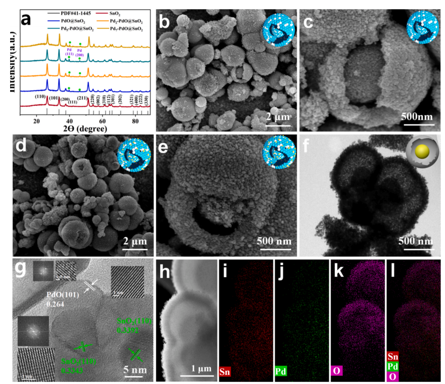 图2.(a)所有样品的XRD图谱;(b, c) SnO2的SEMTEM图像;(d, e, f) 5 at.% Pd-PdO/SnO2 DSMsSEMTEM和高分辨率TEM图像;(h)~(l) 5 at.% Pd-PdO/SnO2的能量色散X射线光谱(EDS)元素(SnPdO)映射图。