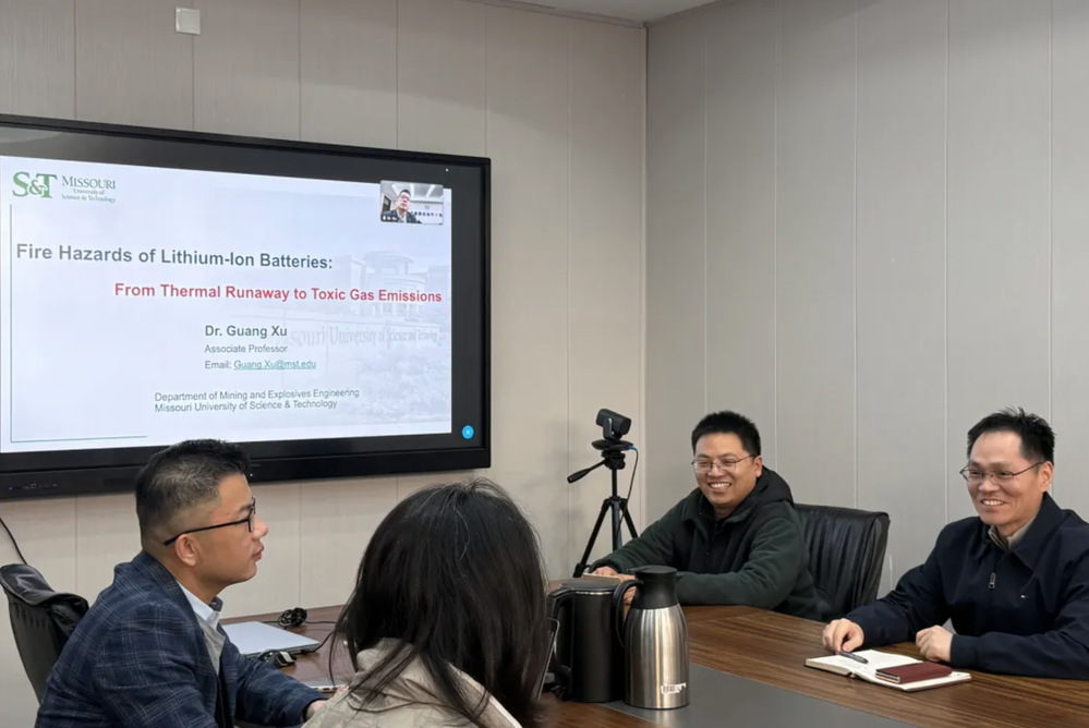 2026年1月6日下午,中国矿业大学职业健康研究院在文昌综合楼305会议室举办专题学术报告会。本次报告特邀密苏里科技大学Guang Xu教授作题为“Fire Hazards of Lithium-Ion Batteries: From Thermal Runaway to Toxic Gas Emissions”的学术报告,围绕锂离子电池火灾危险性,从热失控机理到有毒气体排放等关键问题展开系统讲解。报告以及师生间的交流互动,均全程使用英文进行,现场学术氛围浓厚。